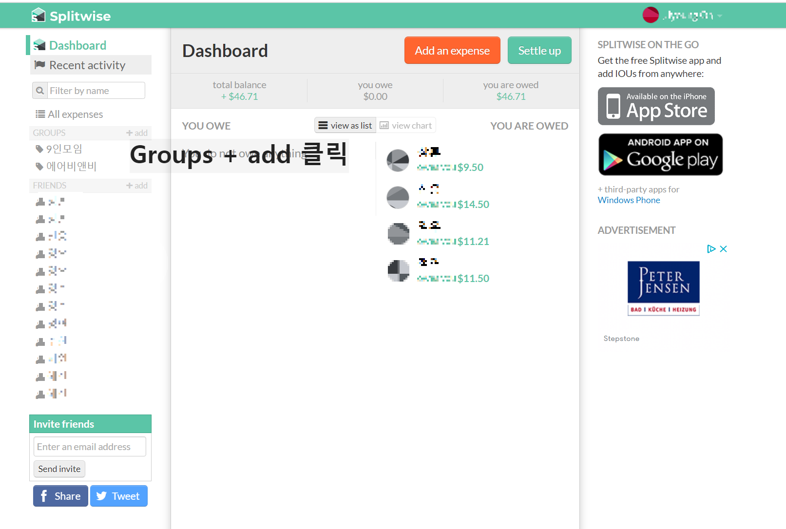 3) 그룹명에 인원이 추가된채로 홈페이지가 생성되는데 이후 Add an expens를 클릭해주면 된다.