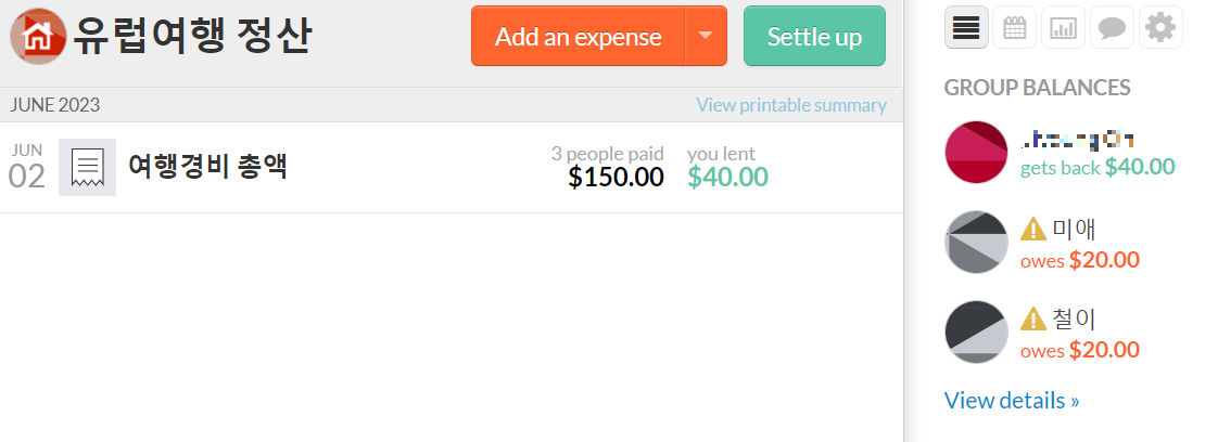 - 이름 옆에 마우스커서를 대면 누가 얼마에게 얼마를 주어야 하는 지 상세한 정보도 확인 가능함!