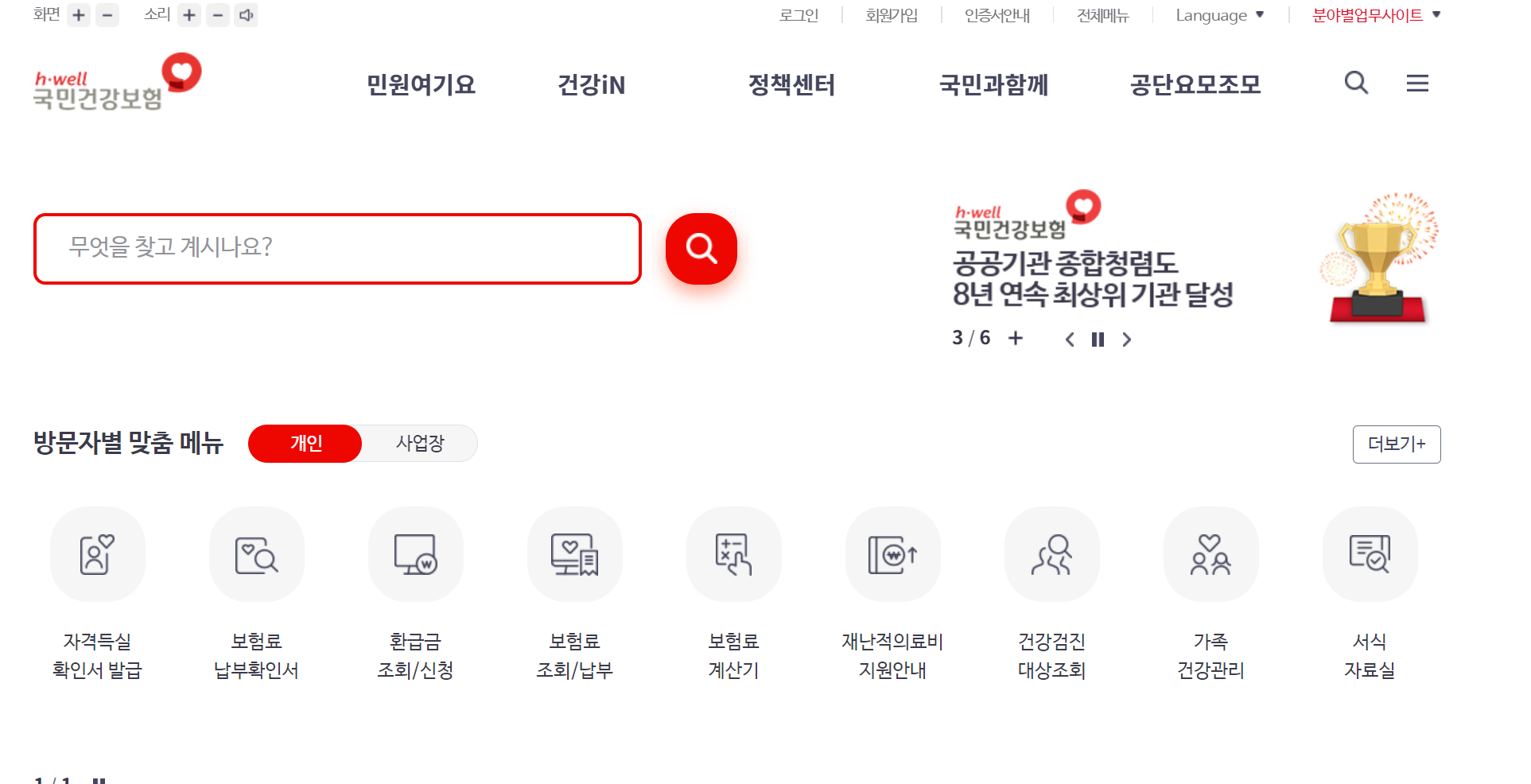 3. 로그인 후, 메인 페이지에서 '건강IN' 메뉴를 클릭 후 건강검진 대상 조회